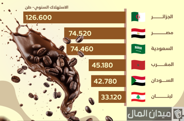 على حسب آخر إحصائيات هذا النصف الأول من عام 2024 ميلاديًا وإعلان قائمة بأكثر الجدول العربية من حيث استهلاك القهوة، فجاءت دولة الجزائري المقدمة بمعدل استهلاك سنوي 126,600 طن، بينما مصر تحتل المركز الثاني باستهلاك يصل إلى 72,520 طن سنويًا.